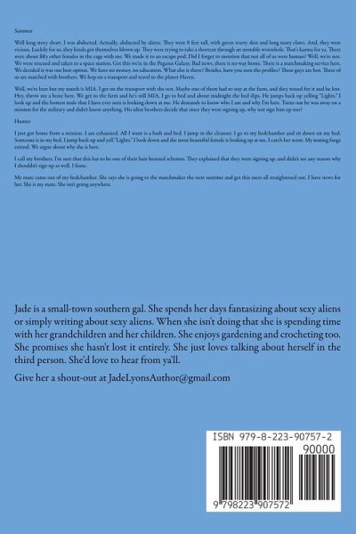 Summer Well long story short. I was abducted. Actually, abducted by aliens. They were 8 feet tall, with green warty skin and long nasty claws. And, they were vicious. Luckily for us, they kinda got themselves blown up. They were trying to take a shortcut through an unstable wormhole. That's karma for ya. There were about fifty other females in the cage with me. We made it to an escape pod. Did I forget to mention that not all of us were human? Well, we're not. We were rescued and taken to a space station. Get this we're in the Pegasus Galaxy. Bad news, there is no way home. There is a matchmaking service here. We decided it was our best option. We have no money, no education. What else is there? Besides, have you seen the profiles? These guys are hot. Three of us are matched with brothers. We hop on a transport and travel to the planet Haven. Well, we're here but my match is MIA. I get on the transport with the rest. Maybe one of them had to stay at the farm, and they tossed for it and he lost. Hey, throw me a bone here. We get to the farm and he's still MIA. I go to bed and about midnight the bed dips. He jumps back up yelling "Lights." I look up and the hottest male that I have ever seen is looking down at me. He demands to know who I am and why I'm here. Turns out he was away on a mission for the military and didn't know anything. His idiot brothers decide that since they were signing up, why not sign him up too? Hunter I just got home from a mission. I am exhausted. All I want is a bath and bed. I jump in the cleanser. I go to my bedchamber and sit down on my bed. Someone is in my bed. I jump back up and yell "Lights." I look down and the most beautiful female is looking up at me. I catch her scent. My mating fangs extend. We argue about why she is here. I call my brothers. I'm sure that this has to be one of their hair-brained schemes. They explained that they were signing up, and didn't see any reason why I shouldn't sign up as well. I fume. My mate came out of my bedchamber. She says she is going to the matchmaker the next suntime and get this mess all straightened out. I have news for her. She is my mate. She isn't going anywhere.