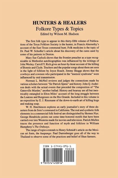 Variety and richness are indeed found in this Publication by the Texas Folklore Society. The first folk type to appear in the book is the hunter, in Francis Abernethy's account of the East Texas communal hunt, which he sees in relation to man's ancient hunting habits. Folk medicine is the topic of the second article, in which Doctor Paul W. Schelder tells about his discovery of the cures used by some of his patients in Denton. In all, this volume consists of sixteen folk tales, with topics ranging from traditional ways of doing things to popular entertainment.