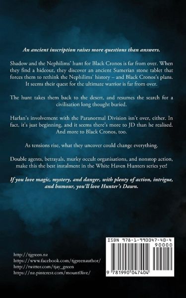 An ancient inscription raises more questions than answers. Shadow and the Nephilims' hunt for Black Cronos is far from over. When they find a hideout, they discover an ancient Sumerian stone tablet that forces them to rethink the Nephilims' history - and Black Cronos's plans. It seems their quest for the ultimate warrior is far from over. The hunt takes them back to the desert, and resumes the search for a civilisation long thought buried. Harlan's involvement with the Paranormal Division isn't over, either. In fact, it's just beginning, and it seems there's more to JD than he realised. And more to Black Cronos, too. As tensions rise, what they uncover could change everything. Double agents, betrayals, murky occult organisations, and nonstop action, make this the best instalment in the White Haven Hunters series yet! If you love magic, mystery, and danger, with plenty of action, intrigue, and humour, you'll love Hunter's Dawn.