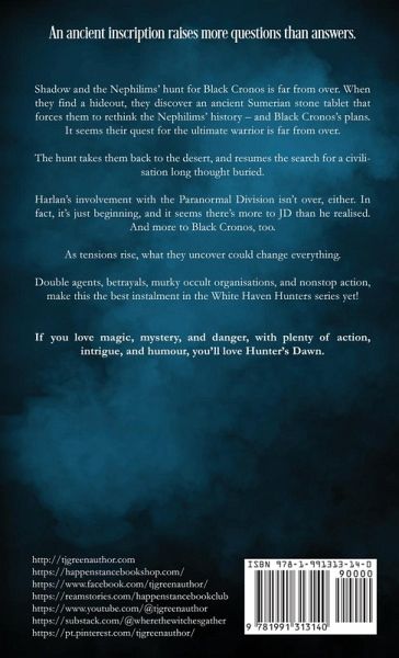 An ancient inscription raises more questions than answers. Shadow and the Nephilims' hunt for Black Cronos is far from over. When they find a hideout, they discover an ancient Sumerian stone tablet that forces them to rethink the Nephilims' history - and Black Cronos's plans. It seems their quest for the ultimate warrior is far from over. The hunt takes them back to the desert, and resumes the search for a civilisation long thought buried. Harlan's involvement with the Paranormal Division isn't over, either. In fact, it's just beginning, and it seems there's more to JD than he realised. And more to Black Cronos, too. As tensions rise, what they uncover could change everything. Double agents, betrayals, murky occult organisations, and nonstop action, make this the best instalment in the White Haven Hunters series yet! If you love magic, mystery, and danger, with plenty of action, intrigue, and humour, you'll love Hunter's Dawn.