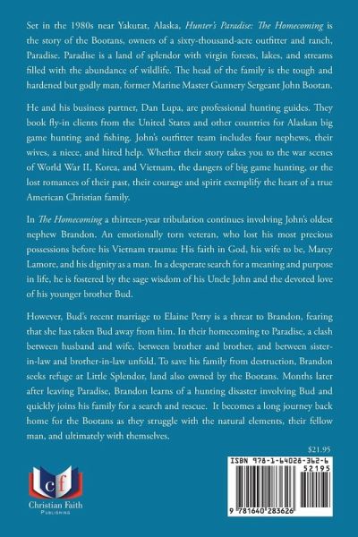 Set in the 1980s near Yakutat, Alaska, Hunter’s Paradise: The Homecoming is the story of the Bootans, owners of a sixty-thousand-acre outfitter and ranch, Paradise. Paradise is a land of splendor with virgin forests, lakes, and streams filled with the abundance of wildlife. The head of the family is the tough and hardened but godly man, former Marine Master Gunnery Sergeant John Bootan. He and his business partner, Dan Lupa, are professional hunting guides. They book fly-in clients from the United States and other countries for Alaskan big game hunting and fishing. John’s outfitter team includes four nephews, their wives, a niece, and hired help. Whether their story takes you to the war scenes of World War II, Korea, and Vietnam, the dangers of big game hunting, or the lost romances of their past, their courage and spirit exemplify the heart of a true American Christian family. In The Homecoming a thirteen-year tribulation continues involving John’s oldest nephew Brandon. An emotionally torn veteran, who lost his most precious possessions before his Vietnam trauma: His faith in God, his wife to be, Marcy Lamore, and his dignity as a man. In a desperate search for a meaning and purpose in life, he is fostered by the sage wisdom of his Uncle John and the devoted love of his younger brother Bud. However, Bud’s recent marriage to Elaine Petry is a threat to Brandon, fearing that she has taken Bud away from him. In their homecoming to Paradise, a clash between husband and wife, between brother and brother, and between sister-in-law and brother-in-law unfold. To save his family from destruction, Brandon seeks refuge at Little Splendor, land also owned by the Bootans. Months later after leaving Paradise, Brandon learns of a hunting disaster involving Bud and quickly joins his family for a search and rescue. It becomes a long journey back home for the Bootans as they struggle with the natural elements, their fellow man, and ultimately with themselves.