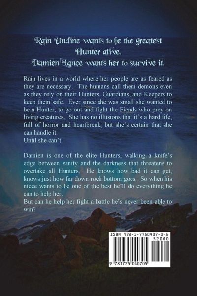 Rain Undine wants to be the greatest Hunter alive. Damien Lance wants her to survive it. Rain lives in a world where her people are as feared as they are necessary. The humans call them demons even as they rely on their Hunters, Guardians, and Keepers to keep them safe. Ever since she was small she wanted to be a Hunter, to go out and fight the Fiends who prey on living creatures. She has no illusions that it's a hard life, full of horror and heartbreak, but she's certain that she can handle it. Until she can't. Damien is one of the elite Hunters, walking a knife's edge between sanity and the darkness that threatens to overtake all Hunters. He knows how bad it can get, knows just how far down rock bottom goes. So when his niece wants to be one of the best he'll do everything he can to help her. But can he help her fight a battle he's never been able to win?