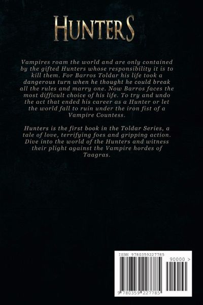 Vampires roam the world and are only contained by the gifted Hunters whose responsibility it is to kill them. For Barros Toldar his life took a dangerous turn when he thought he could break all the rules and marry one. Now Barros faces the most difficult choice of his life. To try and undo the act that ended his career as a Hunter or let the world fall to ruin under the iron fist of a Vampire Countess. Hunters is the first book in the Toldar Series, a tale of love, terrifying foes and gripping action. Dive into the world of the Hunters and witness their plight against the Vampire hordes of Taagras.