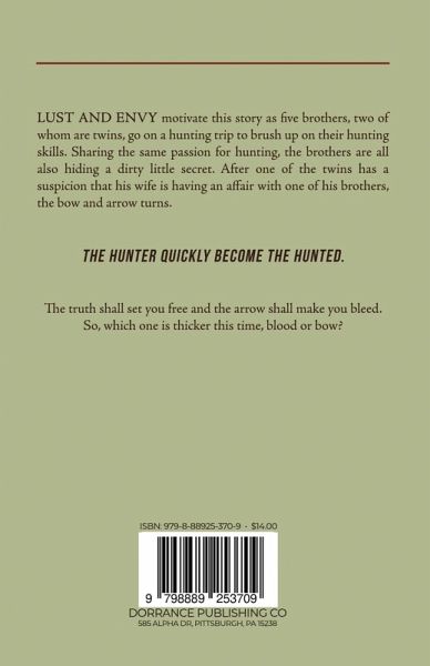Lust and envy motivate this story as five brothers, two of whom are twins, go on a hunting trip to brush up on their hunting skills. Sharing the same passion for hunting, the brothers are all also hiding a dirty little secret. After one of the twins has a suspicion that his wife is having an affair with one of his brothers, the bow and arrow turns. THE HUNTER QUICKLY BECOME THE HUNTED. The truth shall set you free and the arrow shall make you bleed. So, which one is thicker this time, blood or bow?