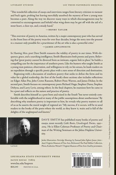 "This overview of poetry in America, written by a major contemporary poet who has served in the front lines of the poetry wars for over four decades, brings the story into the present in a manner only possible for a practitioner of the art who is also a powerful critic."-James Applewhite "This wonderful collection of essays and interviews ranges from literary criticism to memoir and back again, probing but leaving mercifully unsolved the mystery of how a young man becomes a poet. Along the way we discover many ways in which discouragements may be converted to encouragements, and behold what wing shots may be got off with the aid of a stout heart, a clear eye, and a steady hand."-Henry Taylor In Hunting Men, poet Dave Smith reasserts the validity of poetry in our times. With eloquence, grace, and a searching intelligence, Smith illuminates both poems and poets. Believing that "great poetry cannot be divorced from an intimate, organic link to place," he builds a compelling case for the importance of southern poets. Like the hunters who taught Smith as a young man patience, observation, and willingness to rely on his senses, he leads readers on an expedition through a specific poetic place with a sure sense of direction and destination. Beginning with a discussion of southern poetry that seeks to define the form and its value for a global readership, the first of the book's three sections also includes reflections on Edgar Allan Poe, John Crowe Ransom, Robert Penn Warren, and James Dickey. In the second part, Smith focuses on contemporary poets Richard Hugo, Stephen Dunn, Stephen Dobyns, and Larry Levis, among others. In the final chapters, he examines how he came to be a poet and reflects on the nature and practice of poetry. Smith describes himself as a poet born and raised in the South "but never entirely comfortable with the neighborhood or many of the public assumptions about southernness." By describing why southern poetry is important to him, he reveals why poetry matters to all of us as he asserts the moral weight of regional art. "My success, if it occurs, will be to send readers to the books of the poets where the world, as they knew it, waits and is full of the delights of the unglimpsed and known." Dave Smith has published many books of poems and essays, most recently Little Boats, Unsalvaged: Poems, 1992-2004. He has been twice a finalist for the Pulitzer Prize in Poetry and once a finalist for the National Book Critics Circle Award. Other honors include two National Endowment for the Arts Fellowships, a Guggenheim fellowship, the Virginia Prize in Poetry, a Rockefeller Foundation Fellowship to Bellagio, and election to the Fellowship of Southern Writers. He is Elliot Coleman Professor of Poetry and Chairman of the Writing Seminars at the Johns Hopkins University.