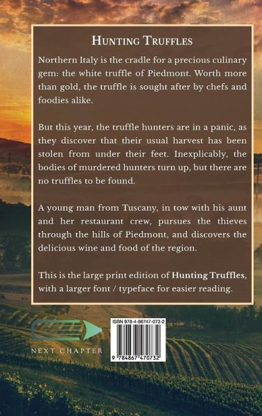 Northern Italy is the cradle for a precious culinary gem: the white truffle of Piedmont. Worth more than gold, the truffle is sought after by chefs and foodies alike. But this year, the truffle hunters are in a panic, as they discover that their usual harvest has been stolen from under their feet. Inexplicably, the bodies of murdered hunters turn up, but there are no truffles to be found. A young man from Tuscany, in tow with his aunt and her restaurant crew, pursues the thieves through the hills of Piedmont, and discovers the delicious wine and food of the region. This is the large print edition of Hunting Truffles, with a larger font / typeface for easier reading.