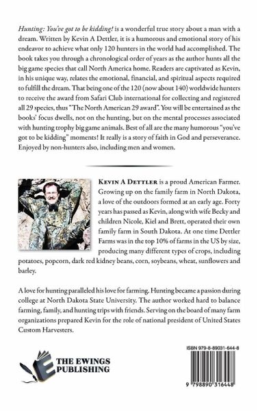 Hunting: You've got to be kidding! is a wonderful true story about a man with a dream. Written by Kevin A Dettler, it is a humorous and emotional story of his endeavor to achieve what only 120 hunters in the world had accomplished. The book takes you through a chronological order of years as the author hunts all the big game species that call North America home. Readers are captivated as Kevin, in his unique way, relates the emotional, financial, and spiritual aspects required to fulfill the dream. That being one of the 120 (now about 140) worldwide hunters to receive the award from Safari…mehr