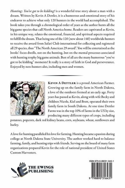 Hunting: You've got to be kidding! is a wonderful true story about a man with a dream. Written by Kevin A Dettler, it is a humorous and emotional story of his endeavor to achieve what only 120 hunters in the world had accomplished. The book takes you through a chronological order of years as the author hunts all the big game species that call North America home. Readers are captivated as Kevin, in his unique way, relates the emotional, financial, and spiritual aspects required to fulfill the dream. That being one of the 120 (now about 140) worldwide hunters to receive the award from Safari Club international for collecting and registered all 29 species, thus "The North American 29 award". You will be entertained as the books' focus dwells, not on the hunting, but on the mental processes associated with hunting trophy big game animals. Best of all are the many humorous "you've got to be kidding" moments! It really is a story of faith in God and perseverance. Enjoyed by non-hunters also, including men and women.