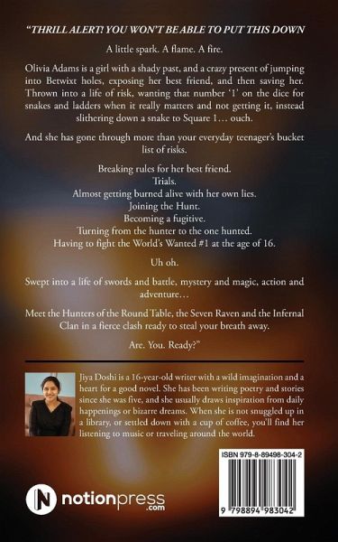 "THRILL ALERT! YOU WON'T BE ABLE TO PUT THIS DOWN A little spark. A flame. A fire. Olivia Adams is a girl with a shady past, and a crazy present of jumping into Betwixt holes, exposing her best friend, and then saving her. Thrown into a life of risk, wanting that number '1' on the dice for snakes and ladders when it really matters and not getting it, instead slithering down a snake to Square 1... ouch. And she has gone through more than your everyday teenager's bucket list of risks. Breaking rules for her best friend. Trials. Almost getting burned alive with her own lies. Joining the Hunt. Becoming a fugitive. Turning from the hunter to the one hunted. Having to fight the World's Wanted #1 at the age of 16. Uh oh. Swept into a life of swords and battle, mystery and magic, action and adventure... Meet the Hunters of the Round Table, the Seven Raven and the Infernal Clan in a fierce clash ready to steal your breath away. Are. You. Ready?"
