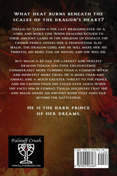 What heat burns beneath the scales of the dragon's heart? Thalia of Tarkin is the last dragonslayer of a long and noble line. When dragons return to their ancient lands in the kingdom of Oghast, the crown prince offers her a proposition. Slay Malik, the Dragon Lord, and he will make her his princess, his bride. Fail or refuse, and she will die. But Malik is by far the largest and fiercest dragon Thalia has ever encountered, considerably more cunning than a common wyrm and infinitely more cruel. He is more than any animal and a much greater threat to the prince and his crown than she could ever guess. When she faces him in combat, Thalia discovers that she and Malik share an ancient bond that goes far beyond the battlefield. He is the dark prince of her dreams.