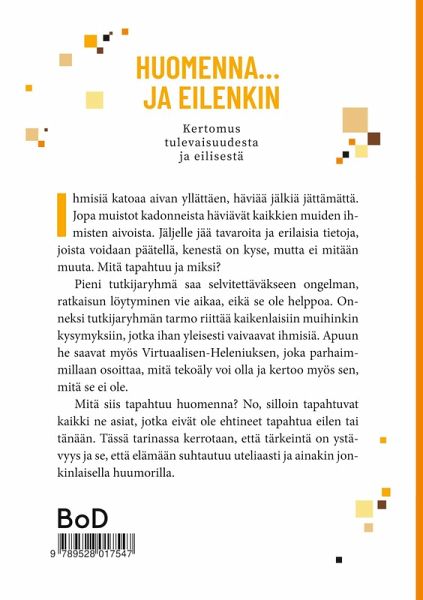 Ihmisiä katoaa aivan yllättäen, häviää jälkiä jättämättä. Jopa muistot kadonneista häviävät kaikkien muiden ihmisten aivoista. Jäljelle jää tavaroita ja erilaisia tietoja, joista voidaan päätellä, kenestä on kyse, mutta ei mitään muuta. Mitä tapahtuu ja miksi? Pieni tutkijaryhmä saa selvitettäväkseen ongelman, ratkaisun löytyminen vie aikaa, eikä se ole helppoa. Onneksi tutkijaryhmän tarmo riittää kaikenlaisiin muihinkin kysymyksiin, jotka ihan yleisesti vaivaavat ihmisiä. Apuun he saavat myös Virtuaalisen-Heleniuksen, joka parhaimmillaan osoittaa, mitä tekoäly voi olla ja kertoo myös sen, mitä se ei ole. Mitä siis tapahtuu huomenna? No, silloin tapahtuvat kaikki ne asiat, jotka eivät ole ehtineet tapahtua eilen tai tänään. Tässä tarinassa kerrotaan, että tärkeintä on ystävyys ja se, että elämään suhtautuu uteliaasti ja ainakin jonkinlaisella huumorilla.