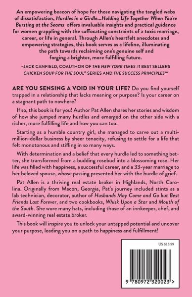 Are you sensing a void in your life? Do you find yourself trapped in a relationship that lacks meaning or purpose? Is your career on a stagnant path to nowhere? If so, this book is for you! Author Pat Allen shares her stories and wisdom of how she jumped many hurdles and emerged on the other side with a richer, more fulfilling life and how you can too. Starting as a humble country girl, she managed to carve out a multi-million-dollar business by sheer tenacity, refusing to settle for a life that felt monotonous and stifling in so many ways. With determination and a belief that every hurdle led to something better, she transformed from a budding rosebud into a blossoming rose. Her life was filled with happiness, a successful career, and a 33-year marriage to her beloved spouse, whose passing presented her with the hurdle of grief. Pat Allen is a thriving real estate broker in Highlands, North Carolina. Originally from Macon, Georgia, Pat's journey included stints as a lab technician, decorator, author of Husbands May Come and Go but Best Friends Last Forever, and two cookbooks, Whisk Upon a Star and Mouth of the South. She wore many hats, including those of an innkeeper, chef, and award-winning real estate broker. This book will inspire you to unlock your untapped potential and uncover your purpose, leading you on a path to happiness and fulfillment!