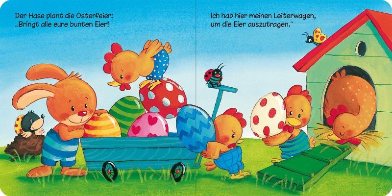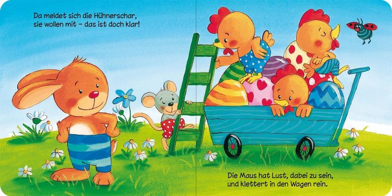Der kleine Hase ist bereit fürs Osterfest. Er holt seinen Leiterwagen und möchte die bunten Eier verteilen. Doch was ist da los? Die ganze Hühnerschar will ihn begleiten. Und wen treffen sie noch auf dem Weg? Dieses kleine Osterbüchlein begleitet den Osterhasen und seine Freunde beim Ostereierverstecken.