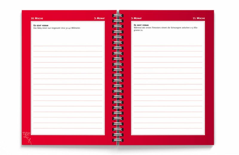 - 2.-9. Monat (je 10 Seiten, 10. Monat inkl. Geburt: 13 Seiten)