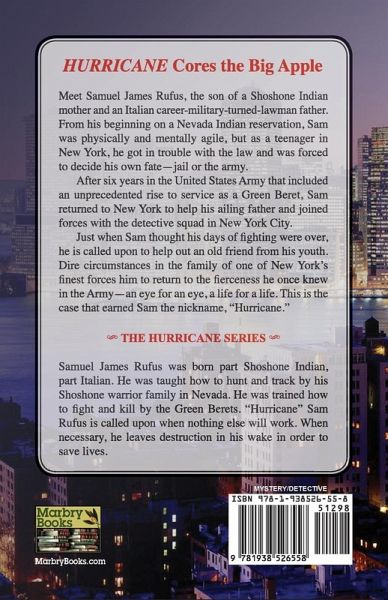 Meet Samuel James Rufus, the son of a Shoshone Indian mother and an Italian career-military-turned-lawman father. From his begin ning on a Nevada Indian reservation, Sam was physically and mentally agile, but as a teenager in New York, he got in trouble with the law and was forced to decide his own fate-jail or the army. After six years in the United States Army that included an unprecedented rise to service as a Green Beret, Sam returned to New York to help his ailing father and joined forces with the detective squad in New York City. Just when Sam thought his days of fi ghting were over, he is called upon to help out an old friend from his youth. Dire circumstances in the family of one of New York's fi nest forces him to return to the fi erceness he once knew in the Army-an eye for an eye, a life for a life. This is the case that earned Sam the nickname, "Hurricane."