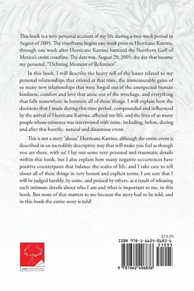 This book is a very personal account of my life during a two-week period in August of 2005. The timeframe begins one week prior to Hurricane Katrina, through one week after Hurricane Katrina battered the Northern Gulf of Mexico's entire coastline. The date was, August 29, 2005; the day that became my personal, "Defining Moment of Reference". In this book, I will describe the heavy toll of the losses related to my personal relationships that existed at that time, the immeasurable gains of so many new relationships that were forged out of the unexpected human kindness, comfort and love that arose out of the wreckage, and everything that falls somewhere in between all of these things. I will explain how the decisions that I made during this time period, compounded and influenced by the arrival of Hurricane Katrina, affected my life, and the lives of so many people whose existence was intertwined with mine, including, before, during and after this horrific, natural and disastrous event. This is not a story "about" Hurricane Katrina, although the entire event is described in an incredibly descriptive way that will make you feel as though you are there, with us! I lay out some very personal and traumatic details within this book, but I also explain how many negative occurrences have positive counterparts that balance the scales of life, and I take care to tell about all of these things in very honest and explicit terms. I am sure that I will be judged harshly, by some, and praised by others, as a result of releasing such intimate details about who I am and what is important to me, in this book. But none of that matters to me because the story had to be told, and in this book the entire story is told!