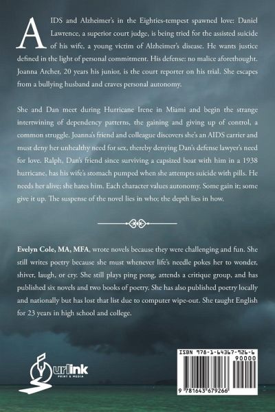 AIDS and Alzheimer's in the Eighties-tempest spawned love: Daniel Lawrence, a superior court judge, is being tried for the assisted suicide of his wife, a young victim of Alzheimer's disease. He wants justice defined in the light of personal commitment. His defense: no malice aforethought. Joanna Archer, 20 years his junior, is the court reporter on his trial. She escapes from a bullying husband and craves personal autonomy. She and Dan meet during Hurricane Irene in Miami and begin the strange intertwining of dependency patterns, the gaining and giving up of control, a common struggle. Joanna's friend and colleague discovers she's an AIDS carrier and must deny her unhealthy need for sex, thereby denying Dan's defense lawyer's need for love. Ralph, Dan's friend since surviving a capsized boat with him in a 1938 hurricane, has his wife's stomach pumped when she attempts suicide with pills. He needs her alive; she hates him. Each character values autonomy. Some gain it; some give it up. The suspense of the novel lies in who; the depth lies in how.