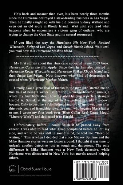 He's back and meaner than ever, it's been nearly three months since the Hurricane destroyed a slave-trading business in Las Vegas. Then he finally caught up with his old nemesis Sidney Wallace and even out an old score in Rhode Island. Wait until you read what happens when he encounters a vicious gang of outlaws, who are trying to change the Gem State and its natural resources? If you liked the way the Hurricane Hit New York, Rocked Wisconsin, Stripped Las Vegas, and Struck Rhode Island. Wait until you read how this Hurricane Mashes Idaho.