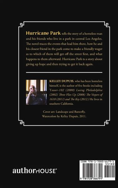 Hurricane Park tells the story of a homeless man and his friends who live in a park in central Los Angeles. The novel traces the events that lead him there, how he and his closest friend in the park come to make a friendly wager as to which of them will get off the street first, and what happens to them afterward. Hurricane Park ts a story about giving up hope and then trying to get it back again.