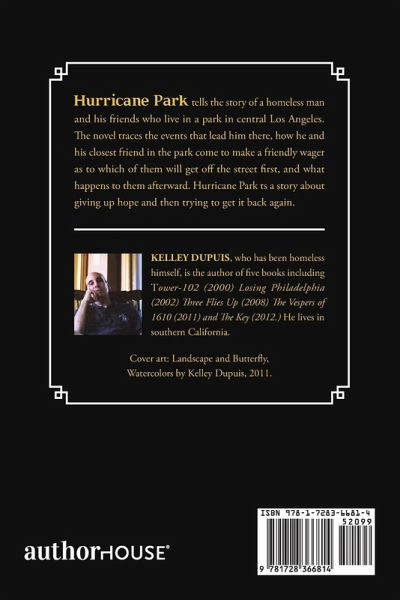 Hurricane Park tells the story of a homeless man and his friends who live in a park in central Los Angeles. The novel traces the events that lead him there, how he and his closest friend in the park come to make a friendly wager as to which of them will get off the street first, and what happens to them afterward. Hurricane Park ts a story about giving up hope and then trying to get it back again.