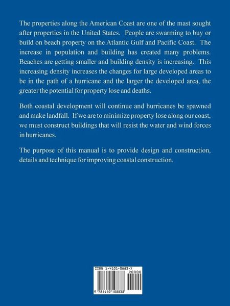The properties along the American Coast are one of the mast sought after properties in the United States. People are swarming to buy or build on beach property on the Atlantic Gulf and Pacific Coast. The increase in population and building has created many problems. Beaches are getting smaller and building density is increasing. This increasing density increases the changes for large developed areas to be in the path of a hurricane and the larger the developed area, the greater the potential for property lose and deaths. Both coastal development will continue and hurricanes be spawned and make landfall. If we are to minimize property lose along our coast, we must construct buildings that will resist the water and wind forces in hurricanes. The purpose of this manual is to provide design and construction, details and technique for improving coastal construction.