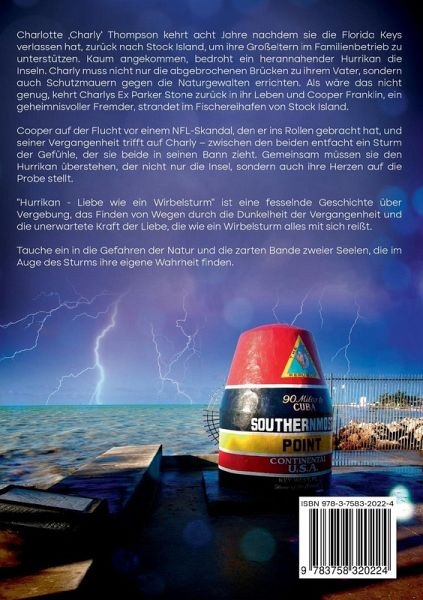 Charlotte "Charly" Thompson kehrt acht Jahre nachdem sie die Florida Keys verlassen hat, zurück nach Stock Island, um ihre Großeltern im Familienbetrieb zu unterstützen. Kaum angekommen, bedroht ein herannahender Hurrikan die Inseln. Charly muss nicht nur die abgebrochenen Brücken zu ihrem Vater, sondern auch Schutzmauern gegen die Naturgewalten errichten. Als wäre das nicht genug, kehrt Charlys Ex Parker Stone zurück in ihr Leben und Cooper Franklin, ein geheimnisvoller Fremder, strandet im Fischereihafen von Stock Island.Cooper auf der Flucht vor einem NFL-Skandal, den er ins Rollen gebracht hat, und seiner Vergangenheit trifft auf Charly - zwischen den beiden entfacht ein Sturm der Gefühle, der sie beide in seinen Bann zieht. Gemeinsam müssen sie den Hurrikan überstehen, der nicht nur die Insel, sondern auch ihre Herzen auf die Probe stellt."Hurrikan - Liebe wie ein Wirbelsturm" ist eine fesselnde Geschichte über Vergebung, das Finden von Wegen durch die Dunkelheit der Vergangenheit und die unerwartete Kraft der Liebe, die wie ein Wirbelsturm alles mit sich reißt. Tauche ein in die Gefahren der Natur und die zarten Bande zweier Seelen, die im Auge des Sturms ihre eigene Wahrheit finden.