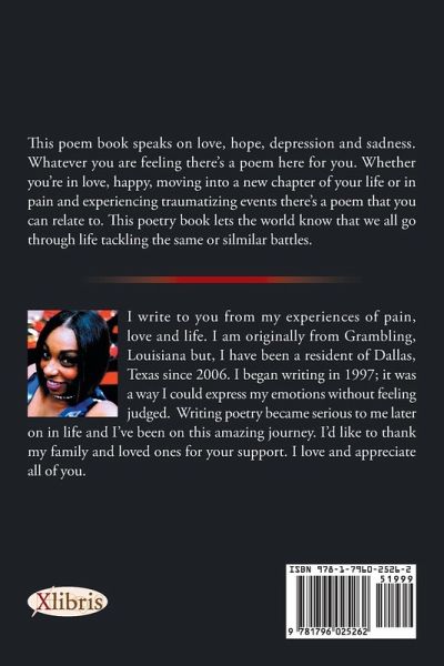 This poetry book speaks on love, hope, depression, and sadness. Whatever you are feeling, there's a poem here for you. Whether you're in love, happy, moving into a new chapter of your life, or in pain and experiencing traumatizing events, there's a poem that you can relate to. This poetry book lets the world know that we all go through life tackling the same or similar battles.