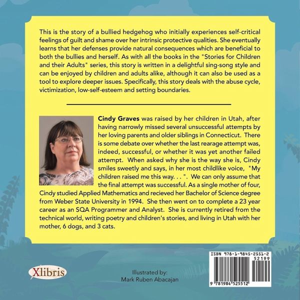 This is the story of a bullied hedgehog who initially experiences self-critical feelings of guilt and shame over her intrinsic protective qualities. She eventually learns that her defenses provide natural consequences which are beneficial to both the bullies and herself. As with all the books in the "Stories for Children and their Adults" series, this story is written in a delightful sing-song style and can be enjoyed by children and adults alike, although it can also be used as a tool to explore deeper issues. Specifically, this story deals with the abuse cycle, victimization, low-self-esteem and setting boundaries.