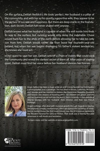 On the surface, Delilah Reddick's life looks perfect. Her husband is a pillar of the community, and with her as his quietly supportive wife, they appear to be the picture of success and happiness. But there are deep cracks in the foundation, dark secrets Delilah has never shared with anyone. Delilah knows what her husband is capable of when the evil inside him finds its way to the surface, but running would only delay the inevitable. Chase would hunt her to the ends of the earth before allowing her to take his only son from him. Delilah would rather die than leave her fourteen-year-old behind, but when her son begins displaying his father's violent tendencies, she knows she must act. In her quest to save her son, Delilah sets off a chain of events that could rock the community and reveal the darkest secret of them all. After years of staying quiet, Delilah must find her voice before her husband silences her forever.
