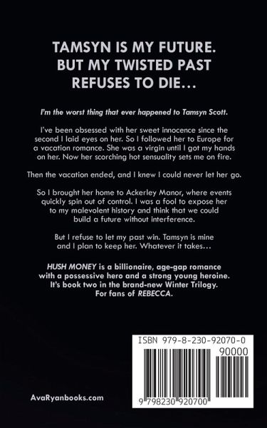 Tamsyn is my future. But my twisted past refuses to die... I'm the worst thing that ever happened to Tamsyn Scott. I've been obsessed with her sweet innocence since the second I laid eyes on her. So I followed her to Europe for a vacation romance. She was a virgin until I got my hands on her. Now her scorching hot sensuality sets me on fire. Then the vacation ended, and I knew I could never let her go. So I brought her home to Ackerley Manor, where events quickly spin out of control. I was a fool to expose her to my malevolent history and think that we could build a future without interference. But I refuse to let my past win. Tamsyn is mine and I plan to keep her. Whatever it takes... HUSH MONEY is a billionaire, age-gap romance with a possessive hero and a strong young heroine. It's book two in the brand-new Winter Trilogy. For fans of REBECCA.