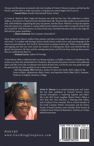 In "Hush, Puppy" a neighborhood, a city and memories are more than just a neighborhood, a city and memories. "Hush, Puppy" is a call and response praise song to the antimony of being Black and Gullah and Southern in Charleston, South Carolina and the world. This chapbook explores familial, societal and community relationships with spice and a dash of humor. "Hush, Puppy" braids love and wrath into one lyrical plait. Meet "Hush, Puppy" at the intersection of the past and the future, sip the bitter tea of its history to explore where we are today.