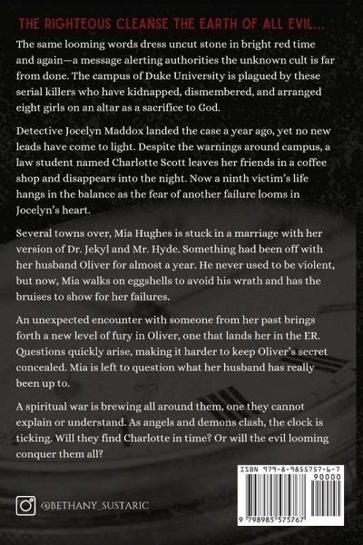 The righteous cleanse the earth of all evil... The same looming words dress uncut stone in bright red time and again-a message alerting authorities the unknown cult is far from done. The campus of Duke University is plagued by these serial killers who have kidnapped, dismembered, and arranged eight girls on an altar as a sacrifice to God. Detective Jocelyn Maddox landed the case a year ago, yet no new leads have come to light. Despite the warnings around campus, a law student named Charlotte Scott leaves her friends in a coffee shop and disappears into the night. Now a ninth victim's life hangs in the balance as the fear of another failure looms in Jocelyn's heart. Several towns over, Mia Hughes is stuck in a marriage with her version of Dr. Jekyl and Mr. Hyde. Something had been off with her husband Oliver for almost a year. He never used to be violent, but now, Mia walks on eggshells to avoid his wrath and has the bruises to show for her failures. An unexpected encounter with someone from her past brings forth a new level of fury in Oliver, one that lands her in the ER. Questions quickly arise, making it harder to keep Oliver's secret concealed. Mia is left to question what her husband has really been up to. A spiritual war is brewing all around them, one they cannot explain or understand. As angels and demons clash, the clock is ticking. Will they find Charlotte in time? Or will the evil looming conquer them all? ******** Breakout Christian author, Bethany Sustaric is a self-proclaimed recovering hot mess and has lived the testimony of a prodigal who's returned home. As a former paramedic of almost twenty years, she developed a foundation of leadership with compassion and has transferred those same qualities into ministry. Almost seven years ago, an injury ended her career, and when she feared all hope was lost, the Lord mightily showed up. During that time, the Lord taught Bethany how to trust Him and how to battle against the schemes of our very real enemy. She lovingly refers to this season of life as her tailor-made wilderness journey. In that desolate place-the Lord restored a broken woman and tempered her into a warrior. Today, Bethany uses her gifts of writing and speaking to share the Lord's truth. Her passion is to help the church boldly stand on God's Word and teach what it means to be a warrior in His army. Be sure to check out her podcast, Confessions of a Recovering Hot Mess, to learn more. She resides in a small mountain community in Central California with her two daughters, their lovable Pitbull, and two sassy chickens. Sustaric is just warming up as she continues to work on future books, sure to captivate audiences everywhere.