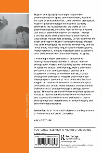 Combining in-depth architectural philosophical investigations of spatiality with a rich and intimate ethnography, Husserl and Spatiality speaks to themes in social and cultural anthropology, from a theoretical perspective that addresses spatial practice and experience. Drawing on fieldwork in Brazil, DuFour develops his analyses of Husserl's phenomenology through spatial accounts of ritual in the Afro-Brazilian religion of Candomblé. The result is a methodological innovation and unique mode of spatial description that DuFour terms a "phenomenological ethnography of space." The book's profoundly interdisciplinary approach makes an incisive contribution relevant to academics and students of architecture and architectural theory, anthropology and material culture, and philosophy and environmental aesthetics.