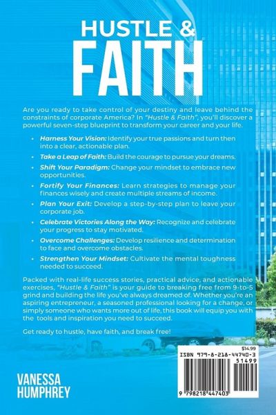 Are you ready to take control of your destiny and leave behind the constraints of Corporate America? In Hustle & Faith, you'll discover a powerful 7-step blueprint to transform your career and life. Harness Your Vision: Identify your true passions and turn them into a clear, actionable plan. Take a Leap of Faith: Build the courage to pursue your dreams. Shift Your Paradigm: Change your mindset to embrace new opportunities. Fortify Your Finances: Learn strategies to manage your finances wisely and create multiple streams of income. Plan Your Exit: Develop a step-by-step plan to leave your corporate job. Celebrate Victories Along the Way: Recognize and celebrate your progress to stay motivated. Overcome Challenges: Develop resilience and determination to face and overcome obstacles. Strengthen Your Mindset: Cultivate mental toughness needed to succeed. Packed with real-life success stories, practical advice, and actionable exercises, Hustle & Faith is your guide to breaking free from the 9-5 grind and building the life you've always dreamed of. Whether you are an aspiring entrepreneur, a seasoned professional looking for a change, or simply someone who wants more out of life, this book will equip you with the tools and inspiration you need to succeed. Get ready to hustle, have faith, and break free.