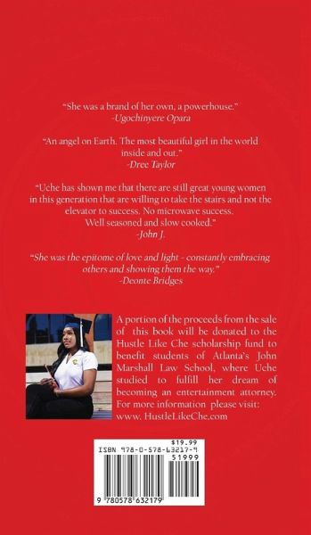 Uche Chukwuma was an incredibly smart and ambitious leader who inspired many through her hustle and dedication to excellence. At the time of her passing, she was attending Atlanta's John Marshall Law School as a part of her dream to become an entertainment attorney. Although Uche's departure came early, her life and achievements will continue to be celebrated and her legacy will live on through her family, friends, and loved ones. Through the spirit of Uche's hustle and boss mentality her book "Hustle Like Che: How to Boss Up and Change Your Life" has been curated in honor of Uche. This book is a unique collection of motivational quotations, sayings, advice and life lessons that Uche published to her social media accounts, followed by heartfelt messages from her loved ones. Proceeds from the sale of this book and other merchandise will be contributed to the "Hustle Like Che" scholarship fund to benefit students of Atlanta's John Marshall Law School. For more information please visit, www.hustlelikeche.com