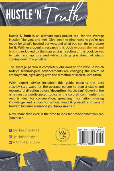 While the mass population craves and yearns for familiar signs of normalcy, the depths of confusion, injustice and falsehood unceasingly multiplies. The average working citizen is undeniably oblivious to the factors that directly impact their income, their health & safety, and the children who would carry out their legacy. Introducing Hustle 'N Truth - 9 Reasons You're Not Ready for Tomorrow and What to Do About It. Throughout this read, the reader gains an education schools fail to provide. Topics like Post-Pandemic Survival, Exposing Vaccines, Reasons to legally own a Firearm, The Artificial Intelligence Industry, Common Investment Mistakes, Breaking Down the Precious Metals Market, and Entrepreneurship during and after a Pandemic, ultimately shift the reader's focus and expands their perspective on the realities of this world paired with real-time solutions. Hustle 'N Truth catches every reader up to speed on everything they've missed and prepares every reader for tomorrow's world changes. Deception has already begun to hit the fan, while the lies relentlessly unfold. Enlighten yourself on how and why to prepare for what is under this world's veil before the veil is completely removed.