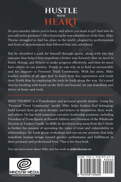 Do you consider where you've been, and where you want to go? And who do you call on for guidance? After learning he was adopted out of the blue, Mike Thorne struggled to find his place in the world, plagued by perfectionism and fears of abandonment that followed him into adulthood. But he identified a path for himself through sports, along with two key concepts that helped him transform a better way forward: that we need to Build, Belong, and Believe to make progress effectively, and that we must have others on our journey. People we can rely on to hold us accountable and for support-a Personal Trust Community. With his story, Mike teaches readers of all ages how to learn from his experiences and reach their North Star by employing the tools he built along the way. He's proof that by hustling with heart on the field and beyond, we can transform and thrive at home and work. MIKE THORNE is a Transformer and personal growth mentor. Using his "Personal Trust Community" model, Mike helps leaders find belonging; build toward their greatest dreams; and believe in themselves, their work, and others. He has held numerous executive leadership positions, including President of Team Sports at Russell Athletic and President of the Wholesale Division at Yankee Candle. In 2020, he decided to step away from the C-Suite to further his mission of spreading the value of trust and vulnerability in relationships. He leads group workshops and one-on-one sessions that help transform human beings toward greater performance and fulfillment in their personal and professional lives. This is his first book. You can learn more about Mike and his work at mikethorne.co