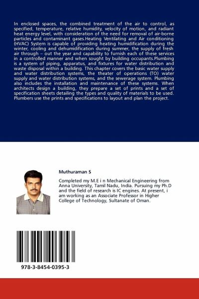 In enclosed spaces, the combined treatment of the air to control, as specified, temperature, relative humidity, velocity of motion, and radiant heat energy level, with consideration of the need for removal of air-borne particles and contaminant gases.Heating Ventilating and Air conditioning (HVAC) System is capable of providing heating humidification during the winter, cooling and dehumidification during summer, the supply of fresh air through out the year and capability to furnish each of these services in a controlled manner and when sought by building occupants.Plumbing is a system of piping, apparatus, and fixtures for water distribution and waste disposal within a building. This chapter covers the basic water supply and water distribution systems, the theater of operations (TO) water supply and water distribution systems, and the sewerage system. Plumbing also includes the installation and maintenance of these systems. When architects design a building, they prepare a set ofprints and a set of specification sheets detailing the types and quality of materials to be used. Plumbers use the prints and specifications to layout and plan the project.