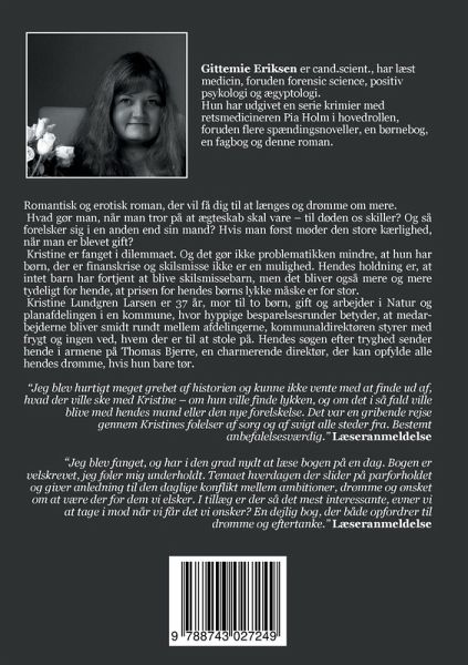 Romantisk og erotisk roman, der vil få dig til at længes og drømme om mere. Hvad gør man, når man tror på at ægteskabet skal vare til døden os skiller og så forelsker sig i en anden end sin mand? Hvis man først møder den store kærlighed, når man er blevet gift? Kristine er fanget i dilemmaet. Og det gør ikke problematikken mindre, at hun har børn, der er finanskrise og skilsmisse ikke er en mulighed. Hendes holdning er, at intet barn har fortjent at blive skilsmissebarn, men det bliver også mere og mere tydeligt for hende, at prisen for hendes børns lykke måske er for stor. Kristine Lundgren Larsen er 37 år, mor til to børn, gift og arbejder i Natur og planafdelingen i en kommune, hvor hyppige besparelsesrunder betyder, at medarbejderne bliver smidt rundt mellem afdelingerne, kommunaldirektøren styrer med frygt og ingen ved, hvem der er til at stole på. Hendes søgen efter tryghed sender hende i armene på Thomas Bjerre, en charmerende direktør, der kan opfylde alle hendes drømme, hvis hun bare tør.