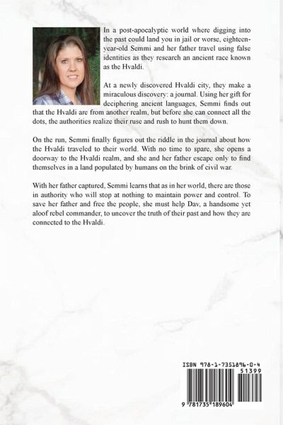 In a post-apocalyptic world where digging into the past could land you in jail or worse, eighteen-year-old Semmi and her father travel using false identities as they research an ancient race known as the Hvaldi. At a newly discovered Hvaldi city, they make a miraculous discovery: a journal. Using her gift for deciphering ancient languages, Semmi finds out that the Hvaldi are from another realm, but before she can connect all the dots, the authorities realize their ruse and rush to hunt them down. On the run, Semmi finally figures out the riddle in the journal about how the Hvaldi traveled to their world. With no time to spare, she opens a doorway to the Hvaldi realm, and she and her father escape only to find themselves in a land populated by humans on the brink of civil war. With her father captured, Semmi learns that as in her world, there are those in authority who will stop at nothing to maintain power and control. To save her father and free the people, she must help Dav, a handsome yet aloof rebel commander, to uncover the truth of their past and how they are connected to the Hvaldi.