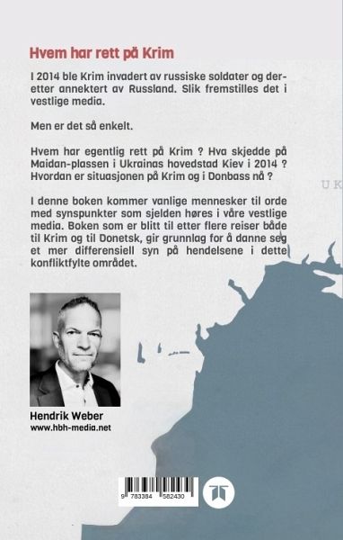 Hvem har rett på Krim?I 2014 ble Krim invadert av russiske soldater og deretter annektert av Russland. Slik fremstilles det i vestlige medier.Men er det så enkelt?Hvem har egentlig rett på Krim? Hva skjedde på Maidan-plassen i Ukrainas hovedstad Kiev i 2014? Hvordan er situasjonen på Krim og i Donbass nå?I denne boken kommer mennesker til orde med synspunkter som sjelden høres i våre vestlige medier. Boken, som har blitt til etter flere reiser både til Krim og Donetsk, gir grunnlag for å danne seg et mer nyansert syn på hendelsene i dette konfliktfylte området.