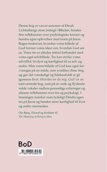 Denne bog er vævet sammen af Dinah Lichtenbergs store indsigt i Bibelen, hendes fine refleksioner over psykologiske temaer og hendes egne oplevelser med troen på Jesus. Bogen beskriver, hvordan vores billede af Gud former vores ideer om, hvordan Gud ser os. Vores tro er således intimt forbundet med vores eget selvbillede. Tro kan styrke vores selvtillid, livslyst og kærlighed til os selv og andre. Men vores billede af Gud kan også forvrænges på en måde, som svækker disse ting og gør det vanskeligt og lidelsesfuldt at gå igennem livet. Hvordan ser du mig, Gud? er en nærværende bog, som på en unik og flydende måde veksler mellem personlige erfaringer og almene refleksioner over tro og psykologi. I læsningen mærker man tydeligt Dinahs egen tro på Jesus og hendes store kærlighed til livet og andre mennesker. Ole Bjerg, Filosof og forfatter til The Meaning of Being a Man