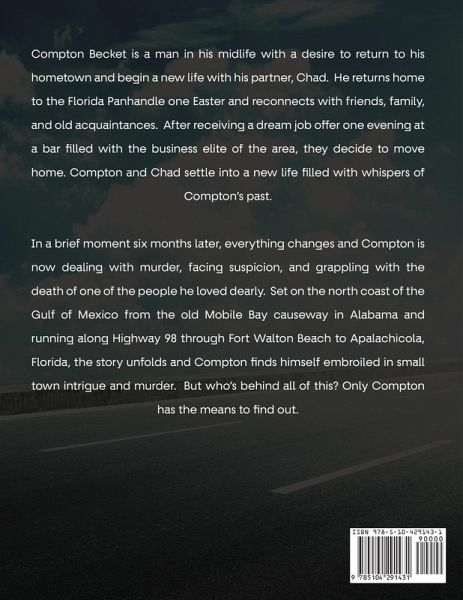 Compton Becket is a man in his midlife with a desire to return to his hometown and begin a new life with his partner, Chad. He returns home to the Florida Panhandle one Easter and reconnects with friends, family, and old acquaintances. After receiving a dream job offer one evening at a bar filled with the business elite of the area, they decide to move home. Compton and Chad settle into a new life filled with whispers of Compton's past. In a brief moment six months later, everything changes and Compton is now dealing with murder, facing suspicion, and grappling with the death of one of the people he loved dearly. Set on the north coast of the Gulf of Mexico from the old Mobile Bay causeway in Alabama and running along Highway 98 through Fort Walton Beach to Apalachicola, Florida, the story unfolds and Compton finds himself embroiled in small town intrigue and murder. But who's behind all of this? Only Compton has the means to find out.