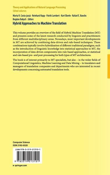 Preface.- Foreword.- Chapter 1. Hybrid Machine Translation Overview.- Part 1: Adding Linguistics into SMT.- Chapter 2. Controllent Ascent: Imbuing Statistical MT with Linguistic knowledge.- Chapter 3. Hybrid Word Alignment.- Chapter 4. Syntax in SMT.- Part 2. Using Machine Learning in MT.- Chapter 5. Machine Learning in RBMT.- Chapter 6. Language-Independent Hybrid MT.- Part 3. Hybrid NLP tools useful for MT.- Chapter 7. Use of Dependency Parsers in MT.- Chapter 8. Word Sense Disambiguation in MT.