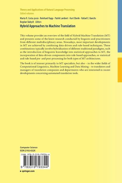 Preface.- Foreword.- Chapter 1. Hybrid Machine Translation Overview.- Part 1: Adding Linguistics into SMT.- Chapter 2. Controllent Ascent: Imbuing Statistical MT with Linguistic knowledge.- Chapter 3. Hybrid Word Alignment.- Chapter 4. Syntax in SMT.- Part 2. Using Machine Learning in MT.- Chapter 5. Machine Learning in RBMT.- Chapter 6. Language-Independent Hybrid MT.- Part 3. Hybrid NLP tools useful for MT.- Chapter 7. Use of Dependency Parsers in MT.- Chapter 8. Word Sense Disambiguation in MT.