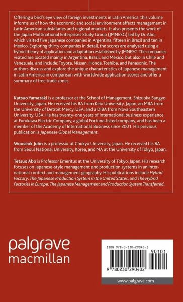 KATSUO YAMAZAKI is a pofessor at the School of Management, Shizuoka Sangyo University, Japan. He received his BA from Keio University, Japan, an MBA from the University of Detroit Mercy, USA, and a DIBA from Nova Southeastern University, USA. He has twenty-one years of international business experience at Furukawa Electric Company, a global Fortune-listed company, and has been a member of the Academy of International Business since 2001. WOOSEOK JUHN is a Professor at Chukyo University, Japan. TETSUO ABO is a member of the Department of Economics, Teikyo University, and Professor Emeritus at Teikyo University, Japan. His research focuses on Japanese management and production systems in an international context and management geography. His publications include Hybrid Factory: The Japanese Production System in the United States and The Hybrid Factories in Europe: The Japanese Management and Production System Transferred.