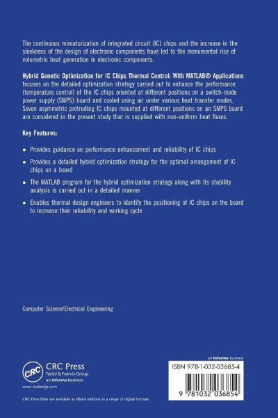 Hybrid Genetic Optimization for IC Chip Thermal Control: with MATLAB® applications focuses on the detailed optimization strategy carried out to enhance the performance (temperature control) of the IC chips oriented at different positions on an SMPS board (Switch mode power supply) and cooled using air under various heat transfer modes.