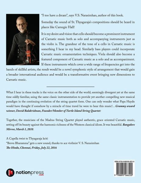 "I too have a dream", says V.S. Narasimhan, author of this book. Someday the sound of St. Thyagaraja's compositions should be heard in places like Carnegie Hall! It is my desire and vision that cello should become a prominent instrument of Carnatic music both as solo and accompanying instruments just as the violin is. The grandeur of the tone of a cello in Carnatic music is something I hear in my head. Similarly bass players could incorporate Carnatic music ornamentation techniques. Viola should also become a featured component of Carnatic music as a solo and as accompaniment. If these instruments which cover a wide range of frequencies get into the hands of skillful artists, the result would be a novel symphonic style of arrangement that would gain a broader international audience and would be a transformative event bringing new dimensions to Carnatic music. What I hear in these tracks is the voice on the other side of the world, seemingly divergent yet at the same time oddly familiar, using the same classic instrumentation to provide yet another compelling new musical paradigm in the continuing evolution of the string quartet form. One can only wonder what Papa Haydn would have thought if somehow by a miracle of time travel he were to hear this music!...Grammy award winner, David Balakrishnan, Founder/ Member of Turtle Island String Quartet: Together, the musicians of the Madras String Quartet played authentic, grace oriented Carnatic music, setting off its beauty against the harmonic richness of the Western classical idiom. It was beautiful. Bangalore Mirror, March 1, 2010 A Capella twist to Thyagaraja kriti "Brova Bharamma" gets a new sound, thanks to ace violinist V. S. Narasimhan The Hindu, Chennai, Friday, July 22, 2016