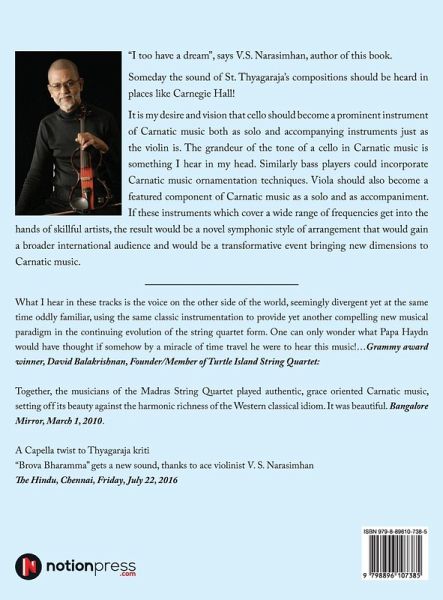 "I too have a dream", says V.S. Narasimhan, author of this book. Someday the sound of St. Thyagaraja's compositions should be heard in places like Carnegie Hall! It is my desire and vision that cello should become a prominent instrument of Carnatic music both as solo and accompanying instruments just as the violin is. The grandeur of the tone of a cello in Carnatic music is something I hear in my head. Similarly bass players could incorporate Carnatic music ornamentation techniques. Viola should also become a featured component of Carnatic music as a solo and as accompaniment. If these instruments which cover a wide range of frequencies get into the hands of skillful artists, the result would be a novel symphonic style of arrangement that would gain a broader international audience and would be a transformative event bringing new dimensions to Carnatic music. What I hear in these tracks is the voice on the other side of the world, seemingly divergent yet at the same time oddly familiar, using the same classic instrumentation to provide yet another compelling new musical paradigm in the continuing evolution of the string quartet form. One can only wonder what Papa Haydn would have thought if somehow by a miracle of time travel he were to hear this music!...Grammy award winner, David Balakrishnan, Founder/ Member of Turtle Island String Quartet: Together, the musicians of the Madras String Quartet played authentic, grace oriented Carnatic music, setting off its beauty against the harmonic richness of the Western classical idiom. It was beautiful. Bangalore Mirror, March 1, 2010 A Capella twist to Thyagaraja kriti "Brova Bharamma" gets a new sound, thanks to ace violinist V. S. Narasimhan The Hindu, Chennai, Friday, July 22, 2016