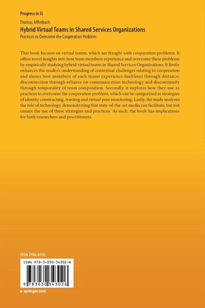 This book focuses on virtual teams, which are fraught with cooperation problems. It offers novel insights into how team members experience and overcome these problems by empirically studying hybrid virtual teams in Shared Services Organizations. It firstly enhances the reader's understanding of contextual challenges relating to cooperation and shows how members of such teams experience faultlines through distance, disconnection through reliance on communication technology and discontinuity through temporality of team composition. Secondly, it explores how they use 22 practices to overcome the cooperation problem, which can be categorized as strategies of identity constructing, trusting and virtual peer monitoring. Lastly, the study analyzes the role of technology, demonstrating that state-of-the-art media can facilitate, but not ensure the use of these strategies and practices. As such, the book has implications for both researchers and practitioners.